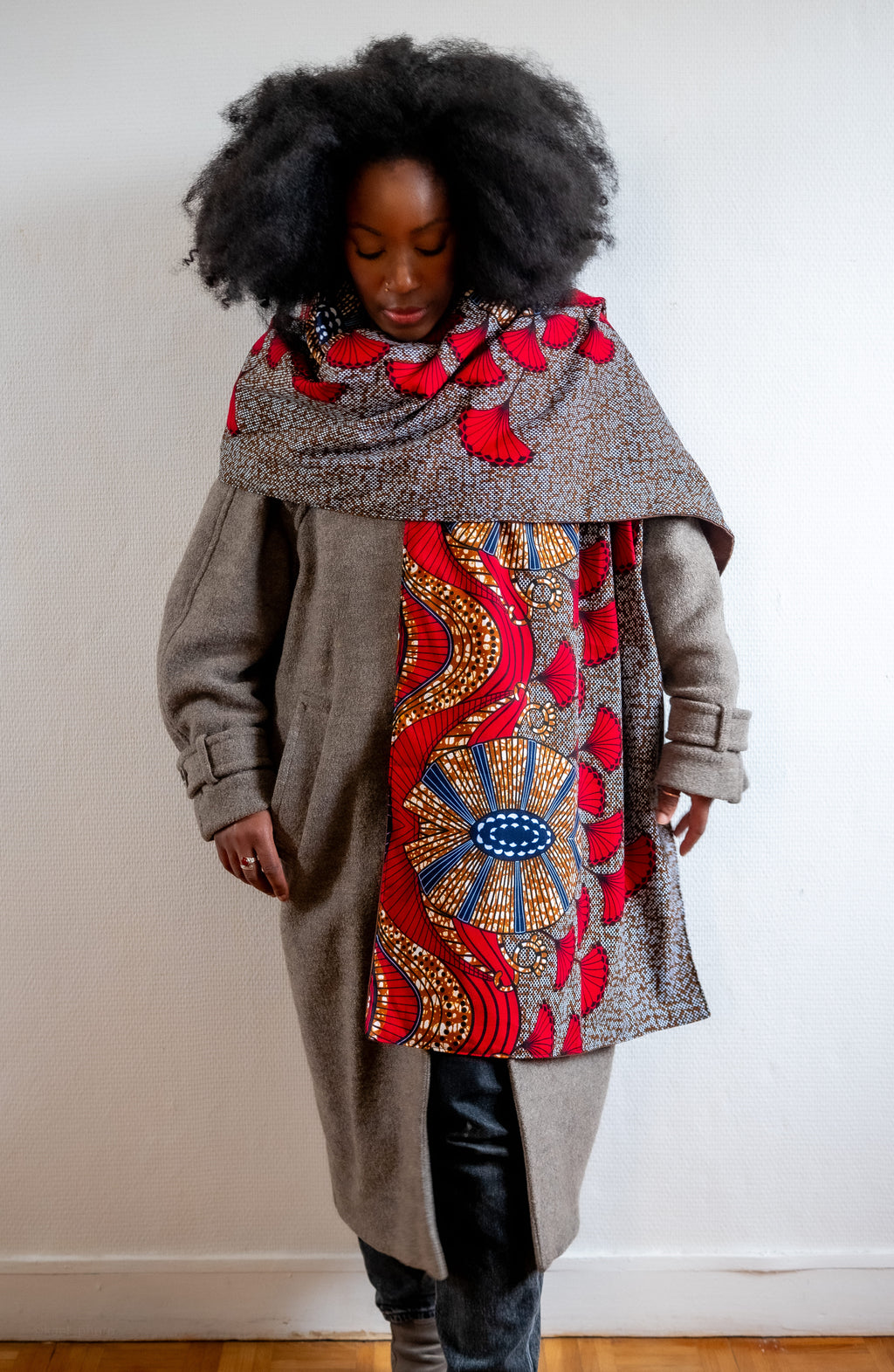Echarpe wax - Ginkgo rouge   Ajoutez une touche unique et chaleureuse à votre garde-robe avec cette écharpe max  bi-matière au design original. Attention vous allez aimer aller dehors drapé de nos écharpes par temps froid   Pou...